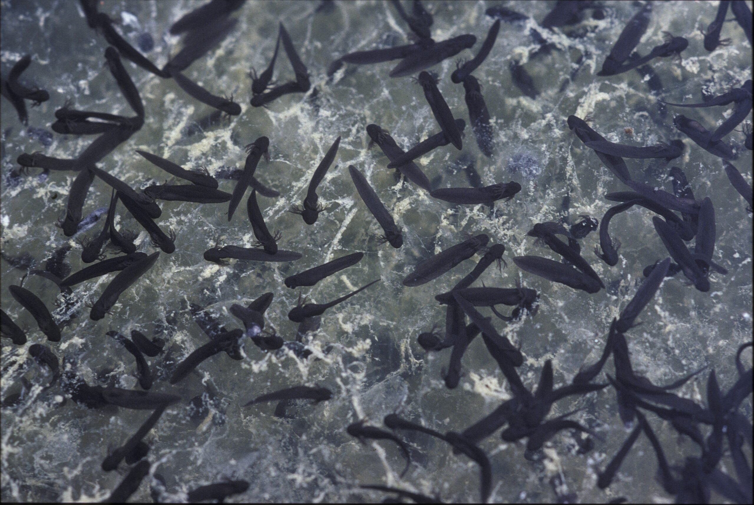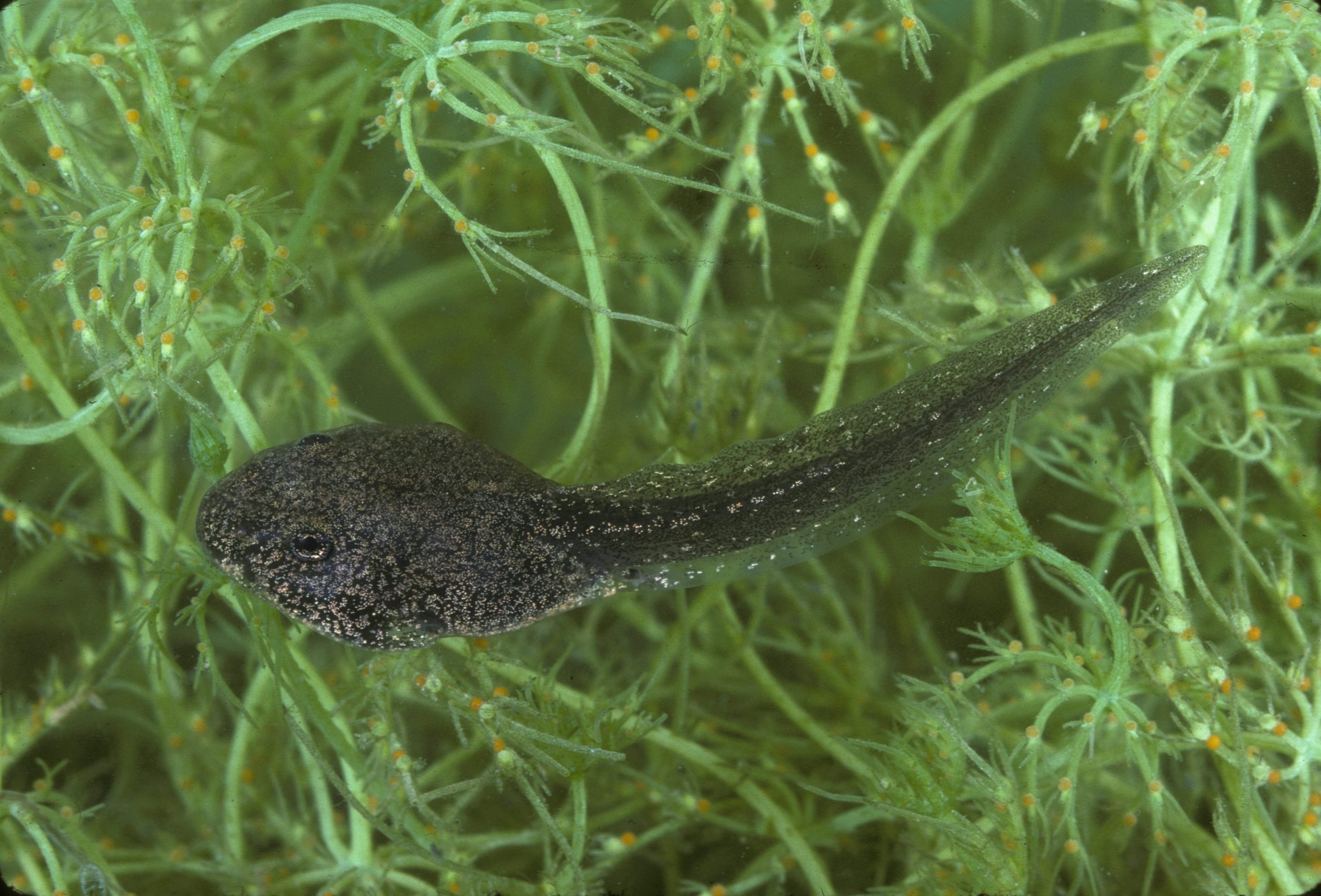 In den einzelnen Eiern der Laichklumpen geht die Zellteilung rasch vonstatten, bis in wenigen Wochen winzige schwarze Kaulquappen schlüpfen und zu Hunderten oder Tausenden noch ziemlich unbeweglich an den leeren Gallerthüllen hängen. Sie wachsen schnell und beginnen schon bald, ihr Gewässer schwimmend zu erkunden und nach Algenbewuchs abzusuchen. Es ist spannend, die Entwicklung der Froschlarven zu beobachten. Zuerst verlieren sie ihre äusserlichen Kiemenbüschel, dann wachsen ihnen plötzlich Hinterbeine, bald gefolgt vom vorderen Beinpaar. Und zu guter Letzt bildet sich der lange Schwanz zurück, verwandelt sich der Raspelmund in ein Froschmaul, wird von Kiemen- auf Lungenatmung umgestellt und stülpen sich die Augen hervor, bis schliesslich im Frühsommer ein kleines Fröschchen den Sprung aus der Metamorphose in ein neues Leben an Land wagt.